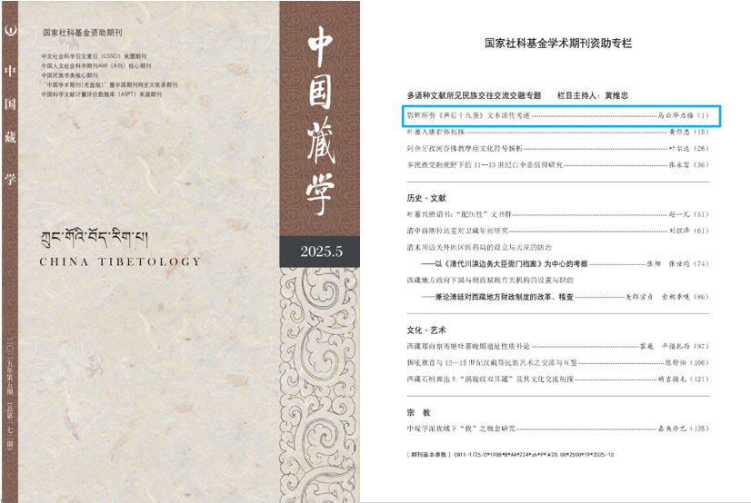 我院乌云毕力格教授的研究成果《鄂辉所奏<善后十九条>文本流传考述》在《中国藏学》(2025年第5期)上发表。